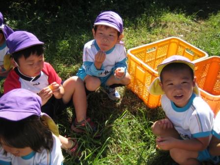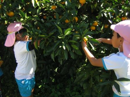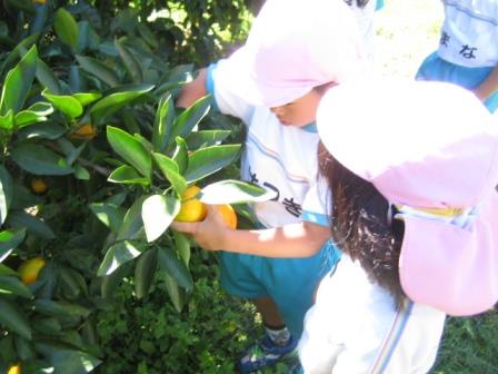 ランチの先生の農園まで、歩いてみかん狩りに行きました。みかんが樹に実っている様子や、葉っぱの形、みかんの色など、興味津々に観察していました。ハサミを使って、自分で収穫したみかんの味は格別だったようで、笑顔も満開でした(*^_^*)もぎたてジューシーみかんはとっても甘くて美味しかったですね~。