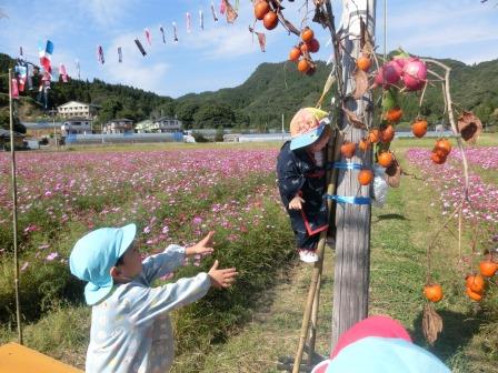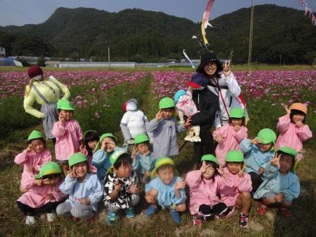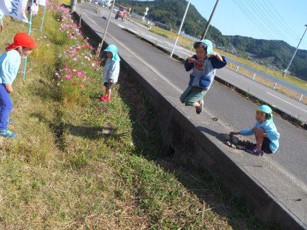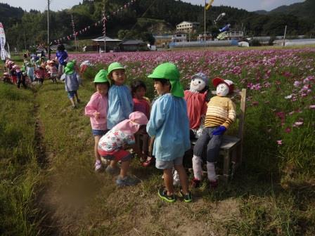 矢越のコスモスとひまわり畑に皆で歩いて出掛けました。そこには、かかしや人形がたくさん置かれていて子ども達は興味津々。面白い格好や何ともいえない表情のかかしさん。かかしの格好を真似る可愛い姿も見られ、何だかほっこりする空間でした。きれいなコスモスに秋を感じて帰ってきました。