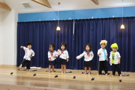 ワクワク★ドキドキ発表会【にじ色の海】 投稿日:2015年12月4日 作成者: 森と風の郷 教諭 新園舎での初めての発表会が行われました。年長児さんは劇の「この役がしたい」「こうやって踊ってもいい?」と踊り方やポーズの提案をし子ども達が作り上げていきました。 年中児さんは「お家でも踊っています。」「側転を自主練しています。」と保護者からのお便りがあり、ワクワクしながら当日を迎えていました。年少児さんは衣装を着るのがとても楽しみだったようです。緊張しながらも手を振る余裕のある子ども達。観客のみなさんに大きな拍手をいただきとびきりの笑顔でいっぱいでした☆