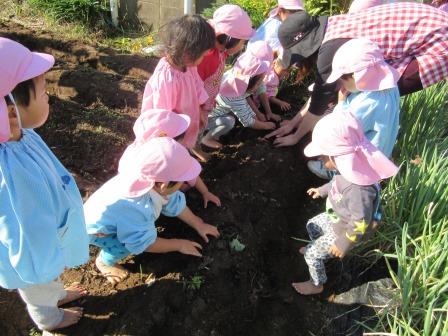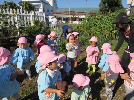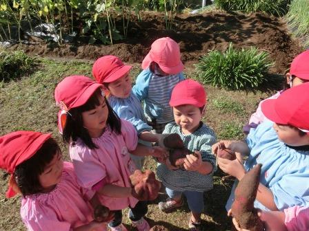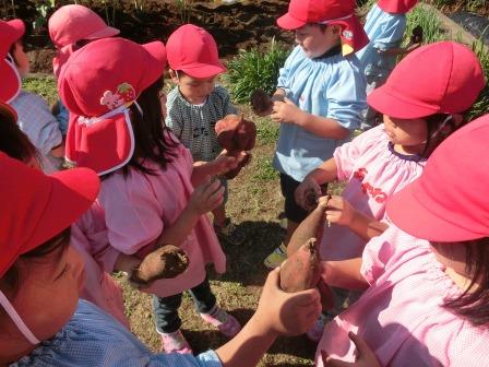 3歳以上の子ども達は要領もよく大きなお芋をゲットしては「先生~見て見て」と誇らしげに見せてくれました。お芋の大きさや長さの比較もしていました。焼きいもをする日が楽しみです。