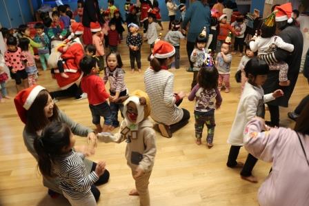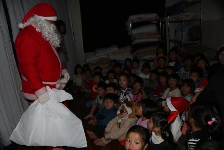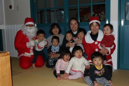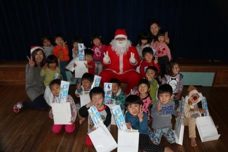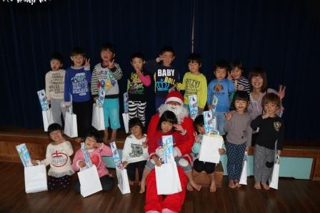 クリスマスソングに合わせてダンスをしたり歌をうたったりしてパーティーを楽しみました。そこへ、サンタさん登場。目をキラキラさせてサンタさんを見つめる子ども達でした。