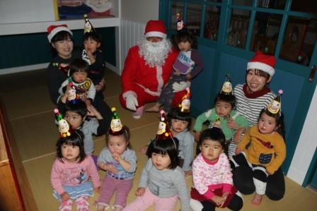 未満児さんはビックリして涙もでましたが優しいサンタさんにプレゼントをもらって、手にしっかり握りしめていました。