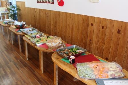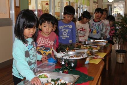 ランチはビッフェ形式。自分の食べたい物を取り分けて、違うクラスのお友達や兄弟姉妹で食べました。