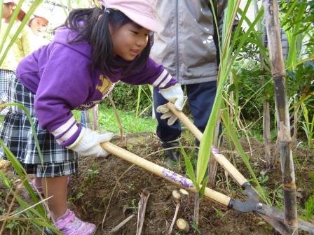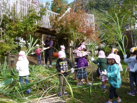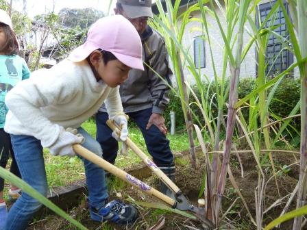 平成22年から始まった「サトウキビ栽培」。職員も収穫の仕方に慣れてきて子どもたちと一緒に、安全に気を付けながら収穫用の大きな剪定ばさみを使って収穫しました。