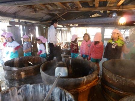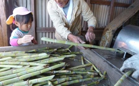 サトウキビ栽培・収穫・黒砂糖加工(さとねり)までの様子はとても充実していて“地域の伝統”への関わりもでき、年長児にとっては貴重な体験となっています。工場の方のご好意で、工場での加工の見学や味見の体験までさせていただきました!
