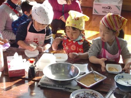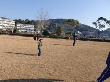 保護者会主催の凧揚げ☆餅つき☆冬祭りがありました。最初にハートフルセンターの広場で凧揚げをしました。快晴のもと、凧も気持ちよさそうに空を泳いでいました。時間が経つにつれ子ども達よりも、保護者やおじいちゃん方が夢中で揚げられるとても素敵な姿が見られました。未満児のお友達はビーニール袋凧を一生懸命走って揚げる姿が可愛かったです。また、おじいちゃんに習って大人顔負けの糸引きをする3歳児さんもいました。空高く揚がった凧は糸を全部使い切る状態に。安定した凧に座って揚げられる一家も見られました(^o^)公民館では臼と杵で貴重な餅つき体験を。お餅を丸め、きな粉やあんこをつけて頂きました。お餅の感触も忘れられないものとなったことでしょう。