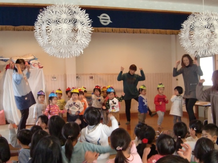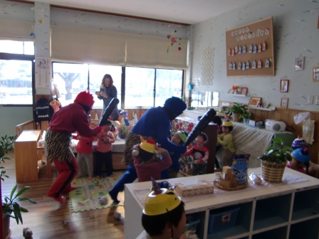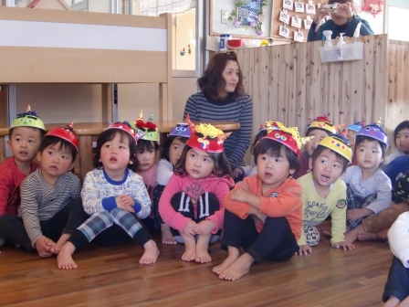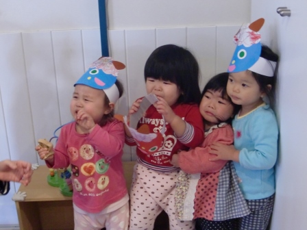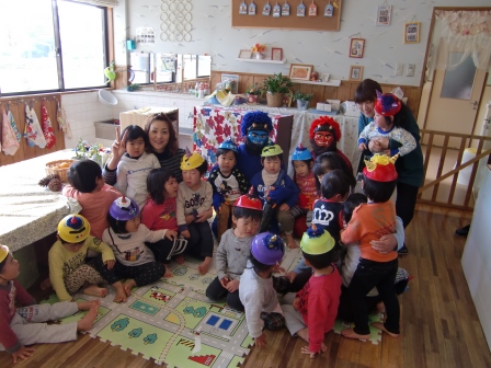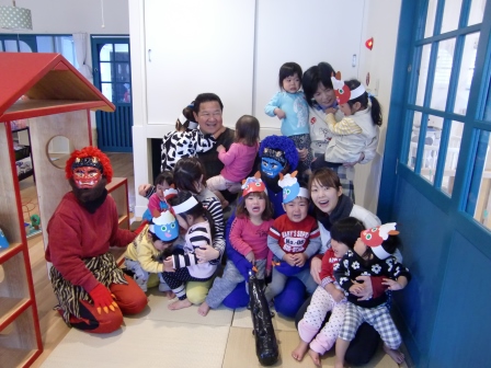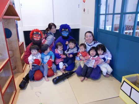 「鬼は~そと!福は~うち!」【にじ色】 投稿日:2016年2月8日 作成者: 森と風の郷 教諭 赤鬼と青鬼が園にやってきました。最初は何事??と状況を飲みこめず鬼と仲良く握手をする小さなお友達。でも、よく見ると何だか怖い鬼さんで、びっくりして涙がこぼれました。ぺんぎん組のお友達は見つからないように、押し入れの下にこっそり隠れる何とも可愛い姿が見られました。最後は仲よく記念撮影をしました。こども達にたくさんの福がきますように☆