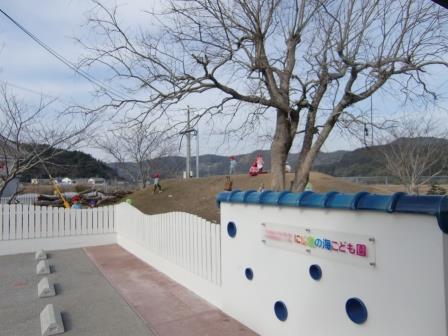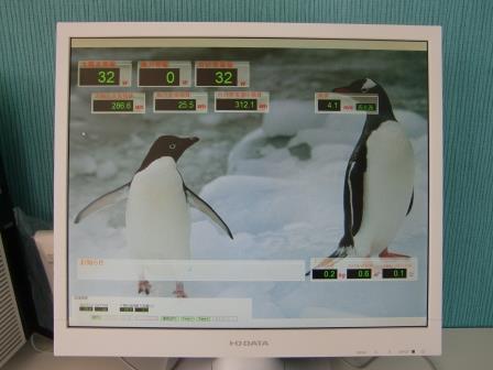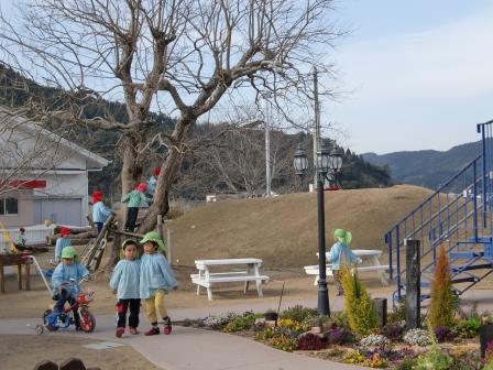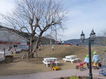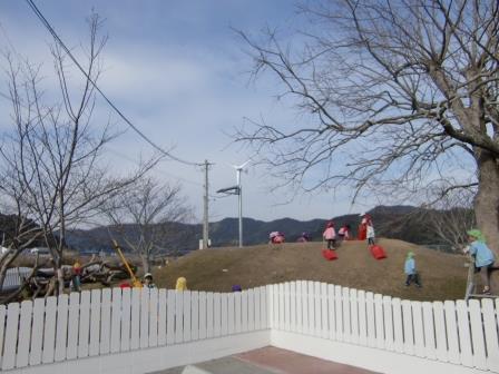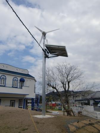 キキの丘と名付けられている築山に風力・太陽光発電施設が設置されました。この発電施設は宮崎県の「新エネルギー普及推進モデル事業」の補助金で設置されたものです。イソップ寓話の「北風と太陽」は競い合って旅人の外套を脱がせようとしましたが、地球環境が瀕死の状態にある今日、「風」と「太陽」が手を取り合って電気をつくろうとしています。「北風と太陽」が21世紀では仲良く電気をつくっています。そんなお話をもとに子ども達に「風と太陽」が電気をつくりだすこと。そのことが住みよい未来をつくることに繋がっていくということを伝えたいと思います。そのための素晴らしい教材となっていくことと思っています。パソコン画面は風速と発電量、積算量などが掲示されています。