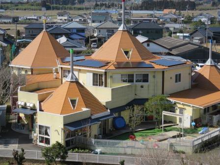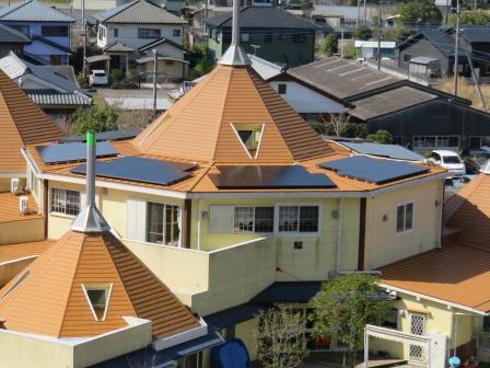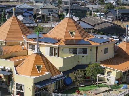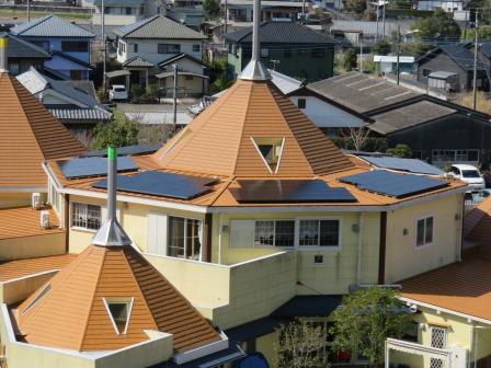 四季の森こども園の屋根に100Wのパネルを144枚設置し、2月15日より太陽光発電が稼働しています。太陽電池出力が14.4kWで、年間17,298kWの電力量で四季の森こども園の年間動力の約半分をまかなうことになります。