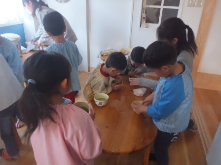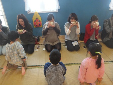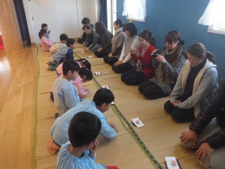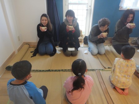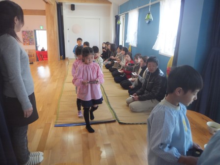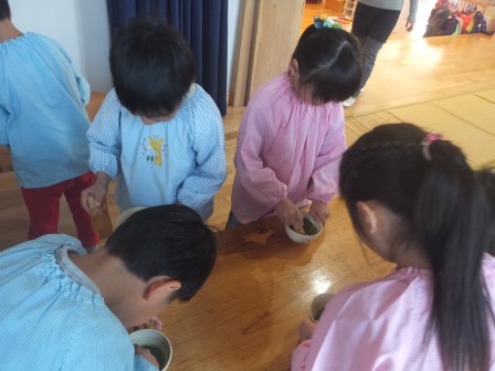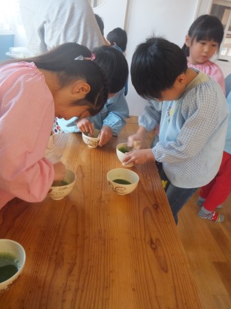 4月より年長児さんが月に1回お茶教室で茶道の作法や心得を楽しく学んできました。この日は、保護者の方にお点前を披露しました。お辞儀の仕方、お菓子やお茶の出し方、抹茶の点て方などひとつひとつ、確かめながら披露している子ども達でした。保護者からは、「美味しかったです。泡がきれいにたっていました。」「作法が身についていました」などの感想が寄せられました。お茶を美味しく頂けただけでなく、子ども達の「おもてなし」の心を喜んで頂けたのではないかと思います。