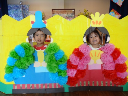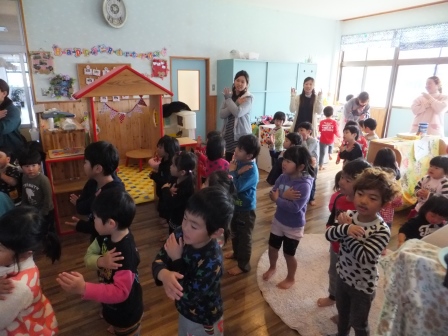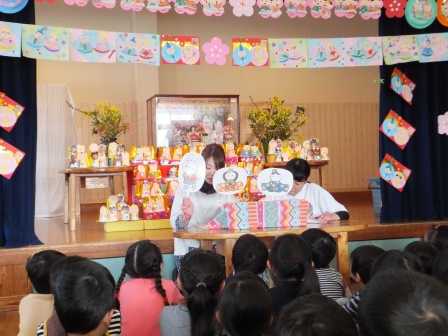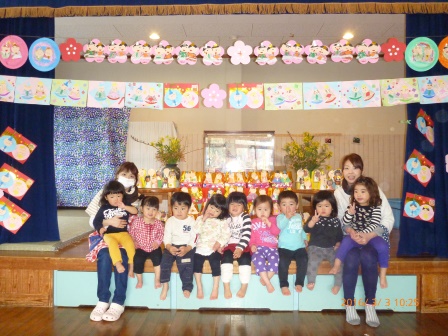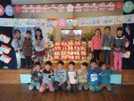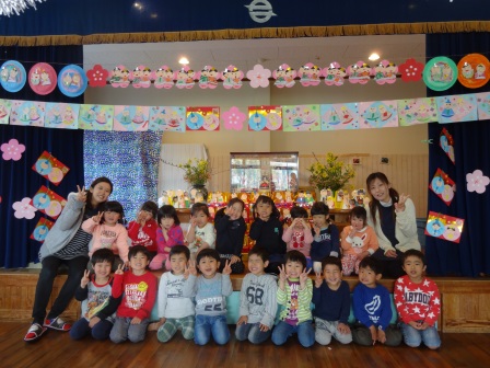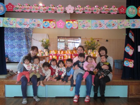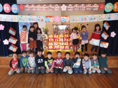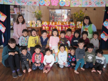 3月3日にひな祭りを行いました。菜の花などの春の花が置かれ、園児の手作り雛人形が飾られとても豪華なひな壇ができあがりました。「楽しいひな祭り」のペープサートを見たり、歌に合わせて踊ったりしました。顔出しパネルでは一緒に写りたいお友達を誘う微笑ましい姿が見られました。病気やケガをしないで、元気にスクスクと育つようにと、紙人形に病気などのよくないことを受け取ってもらっていた風習の桃の節句。子ども達の成長や幸福を皆でお願いしました。