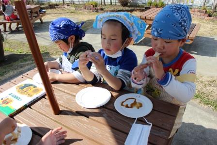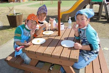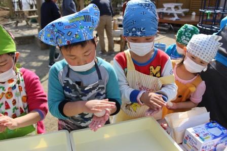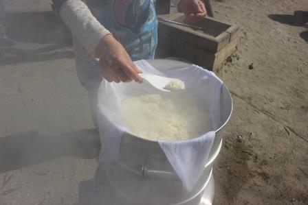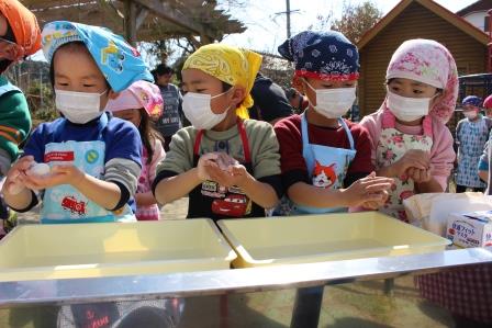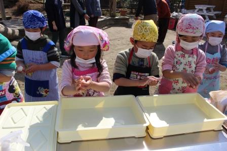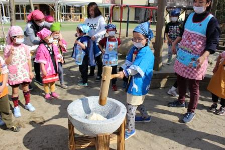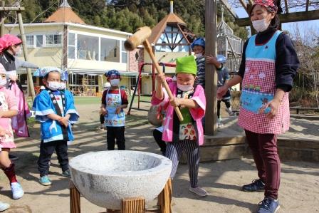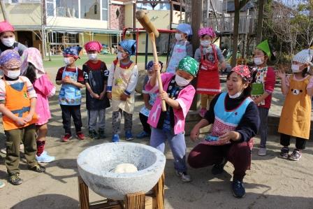 お餅だ、ぺったん!【四季の森】 投稿日:2017年5月19日 作成者: 森と風の郷 教諭 毎年恒例の”お餅つき” 今年は、園でもち米も育てたので、さらに興味津々。5歳児さんが杵と臼を使ってペッタン!ペッタン!とお餅がお米から出来るのを不思議そうに見ながら、楽しんでいました。 ついたお餅をまるめて、しょうゆ・あんこ・黒砂糖の好きな味でいただきました。お餅みたいにほっぺがぷく~っと膨らんだ子どもたちの顔はいい笑顔でしたよ(*^_^*)