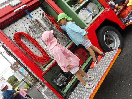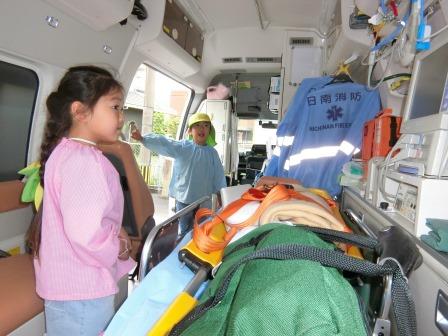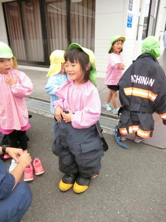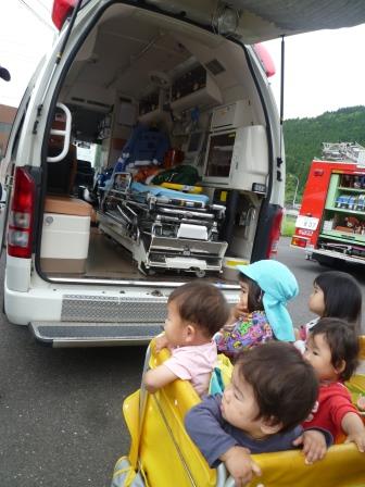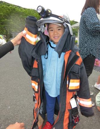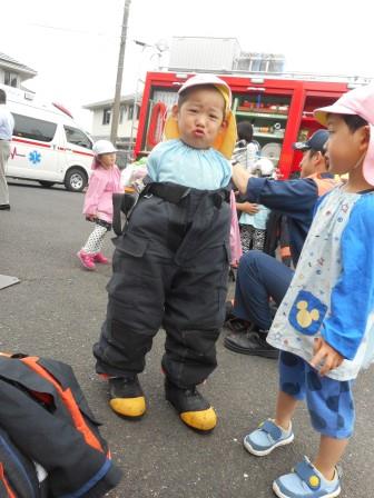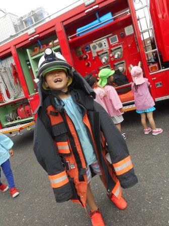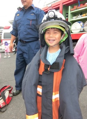 訓練の後は、本物の消防車&救急車に乗せていただいたり、消防服やヘルメットを身に付けさせていただいて、大興奮!!赤くて、大きい消防車は憧れの乗りもの。今回、間近で体験できたことで、将来の夢がひろがったお友だちもいたのではないかな☆