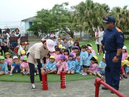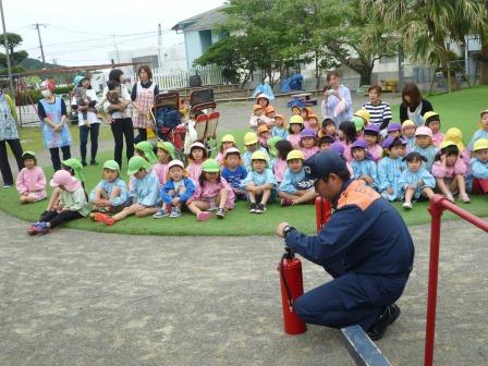 今回の避難訓練は、火災。非常ベルが鳴り「ランチ室からの火災です・・・」の放送を聞き、園庭に避難します。今までの避難訓練の成果で、速やかに避難することができました。その後、消防士の方から4つのお約束などの話があり、消火器の使い方の訓練もしました。先生達が訓練する様子を見て、子どもたちから「ガンバレ~」と、かわいい声援も聞かれました(^_^)