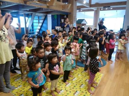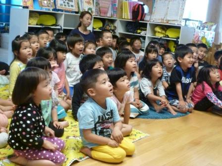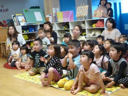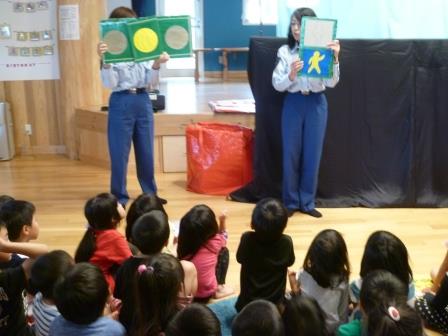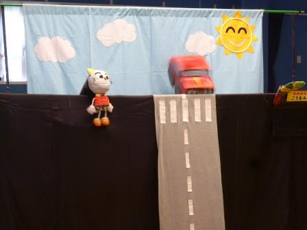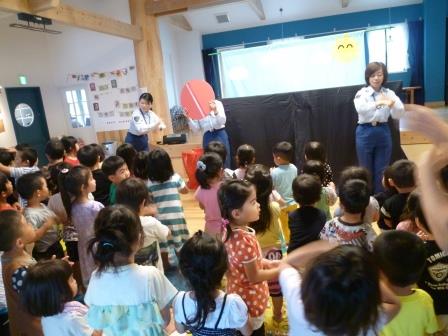 交通安全指導員の方に来ていただいて、交通安全教室がありました。信号のお話を聞いたり、赤・青・黄の色に合わせてダンスをしたりして、信号を分かりやすく理解できましたね。その後、人形劇をみました。みんなの目は真剣で、キラキラ輝いていましたよ!