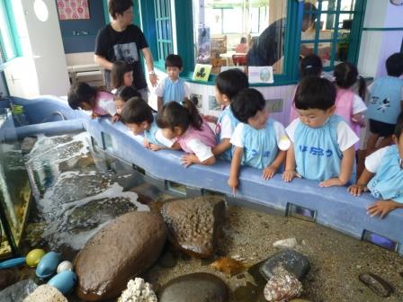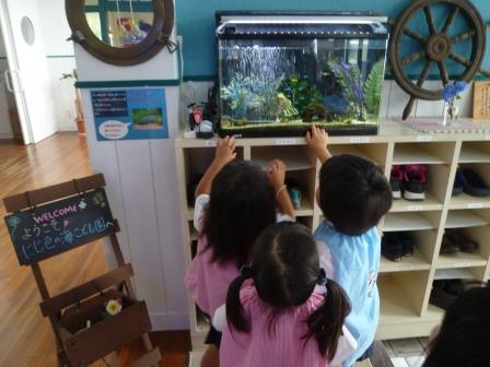 姉妹園である”あがた幼稚園”の3歳児さんが、”にじ色の海こども園”の マーメイド水族館 に見学に来てくれました。ニモ(カクレクマノミ)が泳ぐ大きな水槽やドリー(ナンヨウハギ)が泳ぐ水槽を眺めては、「わぁ、かわいい!」「ニモだぁ~☆」と目をキラキラ輝かせていました。