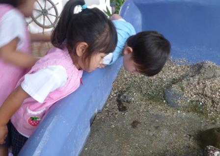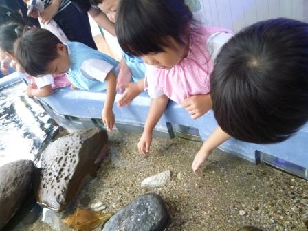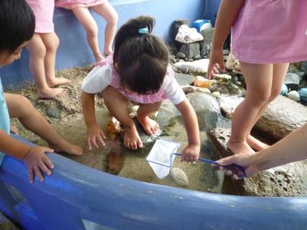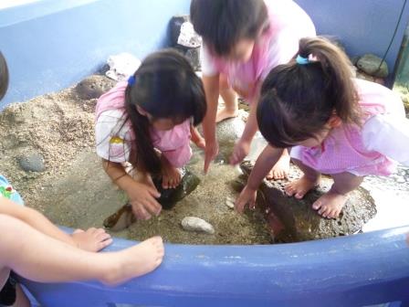 タッチプールを覗いて、おそるおそる手を入れてみる子もいれば、飛び石の上にのぼってヤドカリなどの生き物を触る子もいて、それぞれに楽しんでいました。