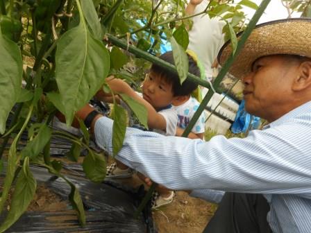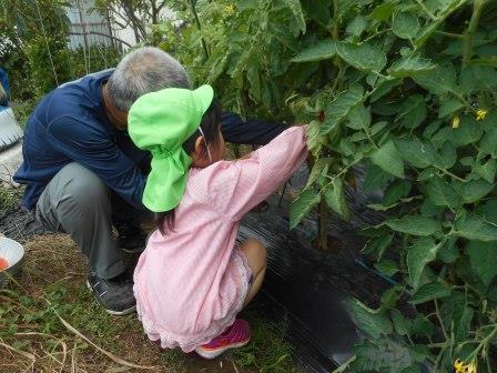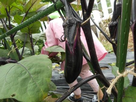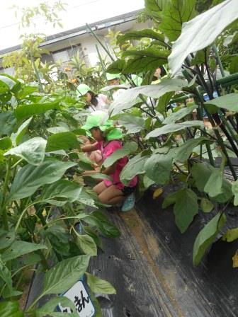 大きな茄子やピーマン、トマトを見て、「わぁ!」と歓声があがり、さっそく収穫しました。