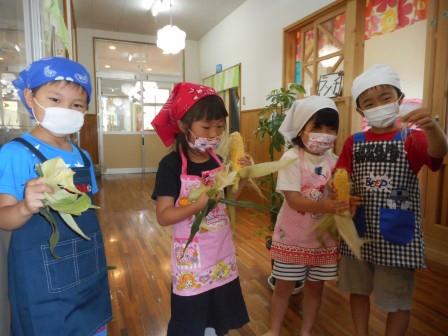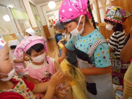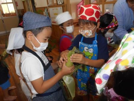 お友だちと協力してトウモロコシの皮をビリッ、ビリッとむきます。「あ!ひげがいっぱい~」と良いながら、中からでてきたひげを丁寧に取っていました。