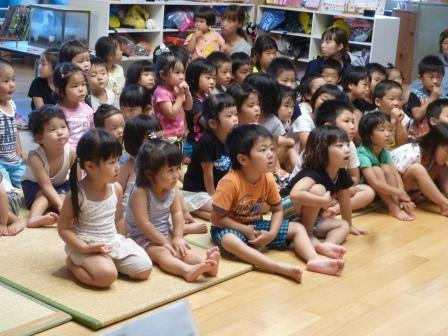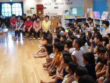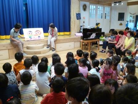 そして、”ぐりとぐら”のボランティアの方が読み語り。月に1回、園にいらして読み語りをして下さるのですが、年に2回、同メンバーの皆さまが「お話隊」として大型絵本の読み語りや歌♪、劇などをしてくださいます。
