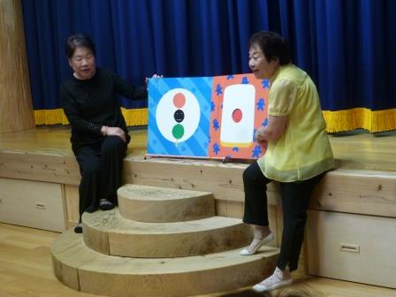 今回は、「えらい、えらい」「あかまるちゃんとくろまるちゃん」「せんたくかあちゃん」の3冊の大型絵本と「シャボン玉とばせ」というたくさんの動物が出てくる可愛い歌を教えて下さいました。