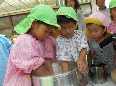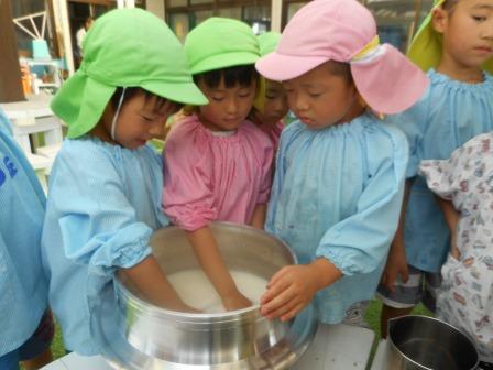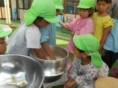 最初に、5歳児さんがお米を研ぎました。水が白濁していく様子をみたり、匂いを嗅いだりしました。