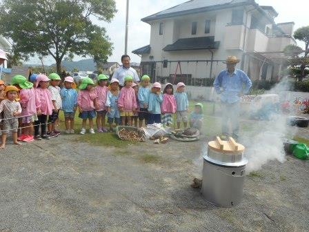その後、園庭で点火して、白い煙がたち、オレンジ色の炎が出る様子をじっと見つめたり、薪の燃える音を聞いたりしました。煙が目に染みたり、匂いが鼻につくようで、鼻をつまんでいる子もいましたね。