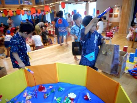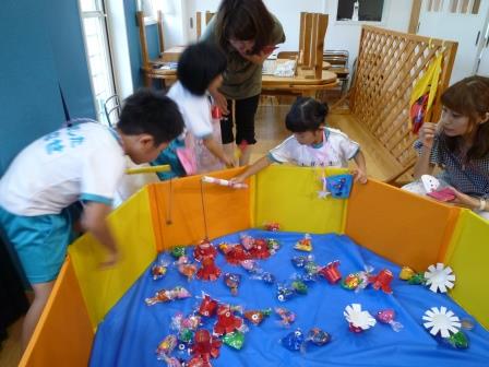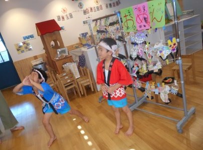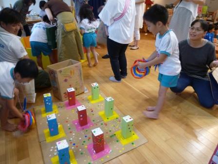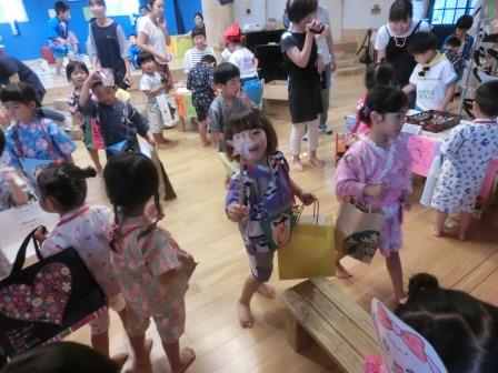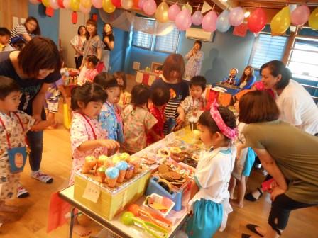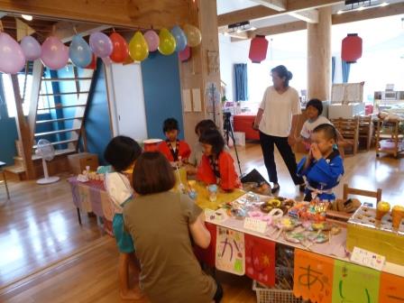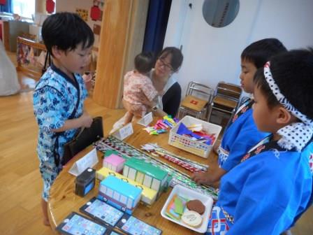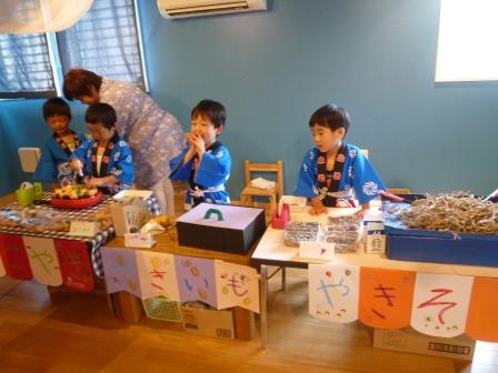 にじ色の海こども園の一大イベントの「お店屋さんごっこ」がありました。提灯や浴衣、甚平が場を一層もり立てて、本物のお祭り屋台に来たような雰囲気です。