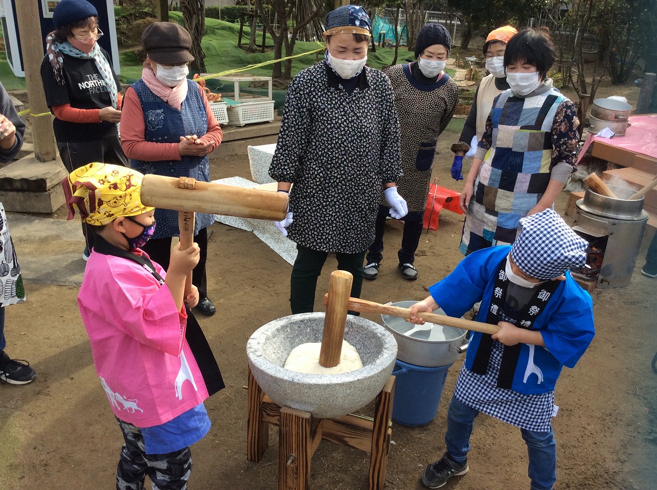 1月7日(金)に年長児さんが、昔ながらの道具を使って餅つきをしました。朝から待ち遠しい様子の子どもたちは準備をしている先生に「いつ始まるの?」「手伝いある?」と積極的にお手伝いしてくれました。エリザベスクラブの地域の方々が釜に火をつけ、もち米を蒸してくださいました。もち米が蒸し上がると、いよいよ餅つきのスタートです。「よいしょ、よいしょ」「1.2!1.2!!」と掛け声に合わせて、杵をタイミングよく動かしていました。お餅がつきあがると、自分の分のお餅を丸めました。お餅は、あんこ・きな粉・さとねりの黒砂糖・さとう醤油の4種類を味わいました。つき立てのお餅の美味しさは、きっと忘れないことでしょう。おかわりの声がたくさん聞かれました。杵でついたお餅はやはり粘りが違いますね。