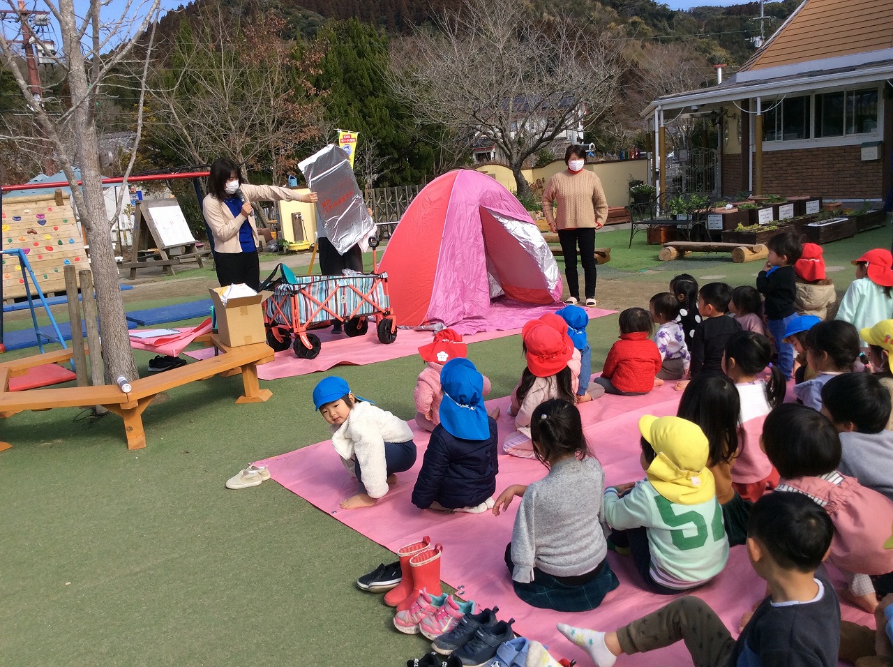 2月1日(火)に防災教室を行いました。1月はお正月に開催される出初め式、1995年1月17日に発生した阪神・淡路大震災と、災害や防災について考える機会があります。まずはいろんな災害を知って、災害に対する心構えや知識、備えが重要となります。また、子どもたちは、地震・火災・土砂崩れ・津波などの災害の写真を見たり、『地震の絵本~こんなときどうするの?』の本を大型スクリーンで見たりして、どうしたら自分自身の身を守れるか考えたりしました。命の大切さを真剣な気持ちで聞いていました。その後、非常持ち出し袋の中に何が入っているかを見たり、実際に非常食を食べたりしました。試食した「ドライカレー」はお湯で15分と簡単にでき、普段と変わらない美味しさであること、保存用のパンもフワフワで美味しくいただくことができることが分かりました。これからも緊急時に対応できるように訓練を行い、飲料水や食料の備蓄等に努めたいと思います。