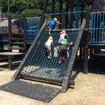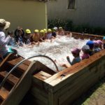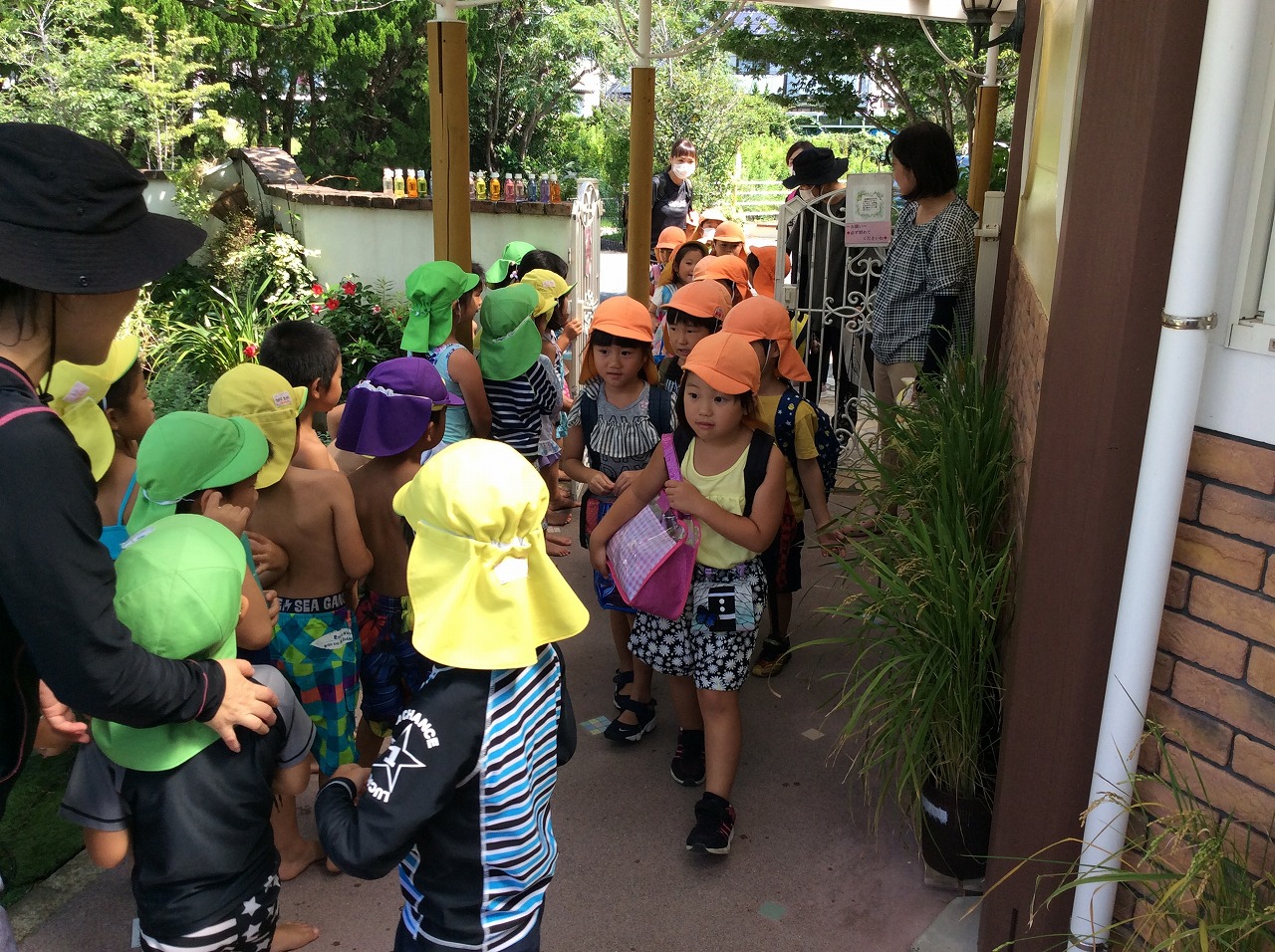 年長児さんが7月29日(水)に南郷町にある姉妹園のにじ色の海こども園のお友だちと2回目の交流をしました。今回は、四季の森こども園でプールや水遊びを楽しみました。初めは恥ずかしそうにしていた子どもたちでしたが、遊んでいくうちに段々と会話も増えていきました。飫肥杉の大プールに一緒に入り、バタ足やワニ歩きなどしたり、氷のコーナーではボタンやお花の入った氷を擦ってみたりして楽しみました。水遊びの後は、一緒にわんぱく公園に行き、お弁当を食べました。木陰の涼しさは格別でした。遊具で遊んだり、氷鬼をしたり、セミの抜け殻を集めたり、木登りしたりとたくさん遊び、帰りの時は、「バイバーイ!また遊ぼうね!!」とバスを見送った子どもたちです。