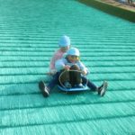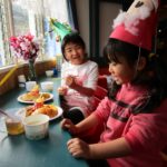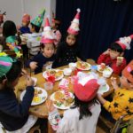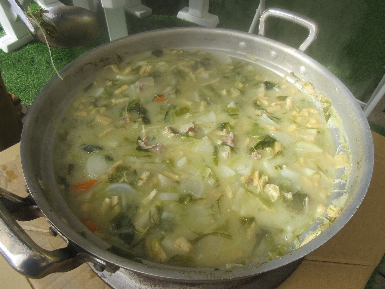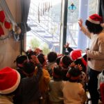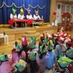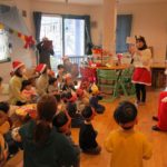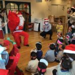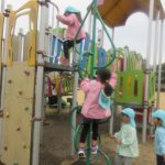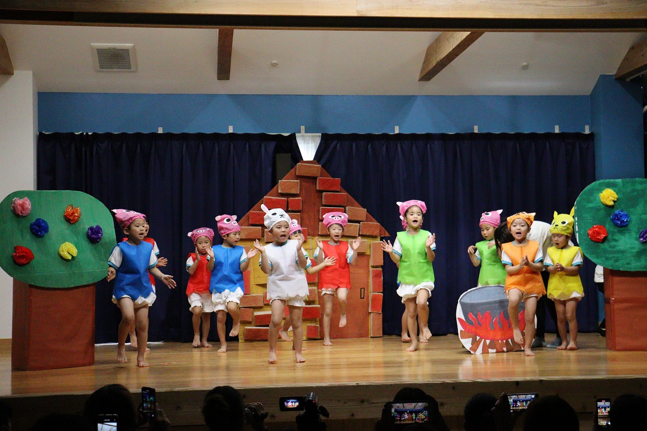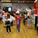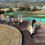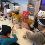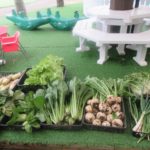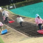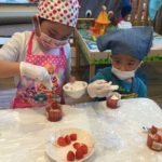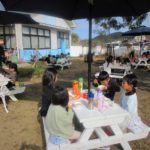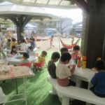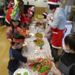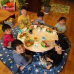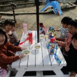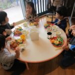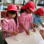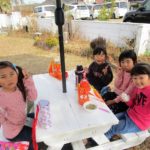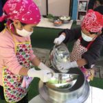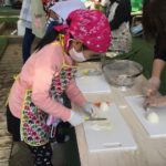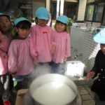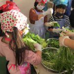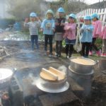 洗った野菜で豚汁作りに挑戦!お米を研いだり、包丁で野菜の切り込みをして、その日のランチの豚汁に入れて全園児でおいしくいただきました。羽釜で炊いたアツアツホカホカのご飯を自分たちでおにぎりにし、温かな豚汁と一緒に食べました。「おかわり~」「おかわりするわぁ」とおにぎりも豚汁もデザートのみかんもきれいになくなる程、最高においしかったようです♪