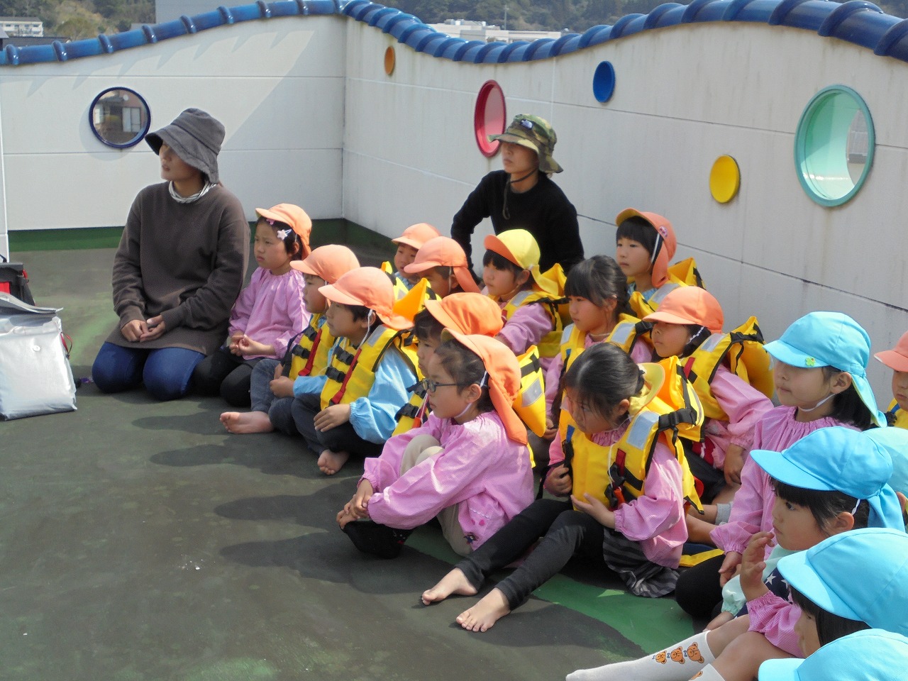園では、避難訓練を兼ねた防災教室を行いました。10年前の東日本大震災の日にあわせた訓練ということで、「命を守る」意識づけをすべく、職員も真剣です。今回は保育中に起きた地震&津波の想定で、全員屋上まで避難しました。園内放送が流れても慌てることなく、しっかり避難をすることができました。この1年間の訓練の成果があらわれていたと思います。5歳児さんは、ライフジャケットを装着して避難・・・とても手際よく装着することができていて、感心しました。避難後、東日本大震災の写真を見ながら、10年前の被害がどれほどに大きかったのか、自分の命を守るためにはどう行動すればいいのかなどの話を先生からしていただき、子どもたちも真剣に聞いていました。職員も非常用キャリーを実際に装着して、装着の仕方やどんな風にすれば素早く避難できるかの確認をしました。
