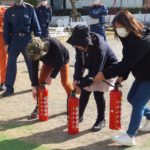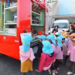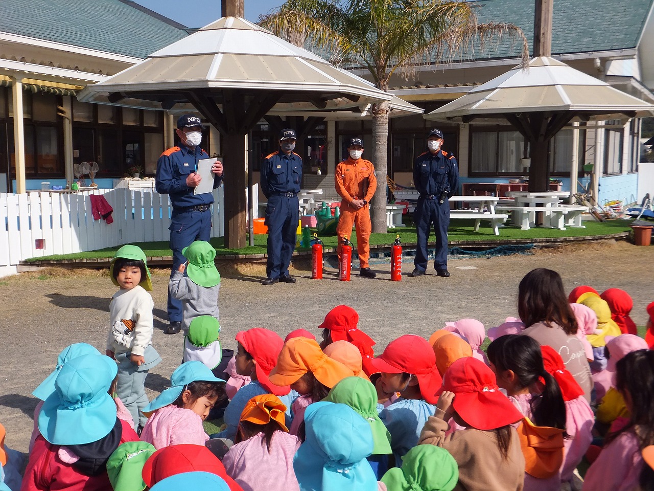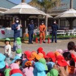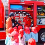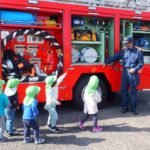 ランチ室からの火災の想定。今回は非常ベルは鳴らしませんでしたが、園内放送が聞こえるとしっかり先生の指示を聞き、口元を押さえて素早く避難できていました。避難後、消防士の方から子どもたちの避難の様子や火災・地震についての話をしていただきました。『おはしも(おさない・はしらない・しゃべらない・もどらない)』の約束もしっかり言えました。その後、職員が消火器を使って火を消す訓練をしました。子どもたちの「がんばれ~!」の声援が力になりました。最後は子どもたち一番のお楽しみ♡消防車に乗せてもらったり、写真を撮ったりして大喜びでした♪さよなら~の場面では、『警光灯』もつけてくださり、子どもたちは大興奮でした。