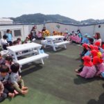 ★3歳児:いるか組さんと・・・テラスで一緒にランチを食べました。なんだか、いつもより美味しかったね!